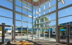 The new gymnasium at Montgomery Middle School is a multi-purpose facility that includes a basketball court, stage platform, weight-training facility, restrooms, and a reception lobby. The high-bay reception lobby is bordered with full-height glass walls. The gymnasium utilizes natural lighting provided by large clerestory windows and skylights.